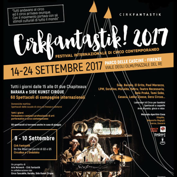 Cirk Fantastik! è un luogo dove entrare in contatto con le varie esperienze artistiche contemporanee ma anche dove semplicemente tessere relazioni e nutrire immaginazione e desiderio. Cirk Fantastik! trasforma per 11 giorni a settembre il Parco delle Cascine in un grande teatro nel verde, invitando compagnie e artisti nazionali e internazionali, proponendo spettacoli, work in progress pensati per poter entrare nel dietro le quinte delle creazioni, cinema outdoor per scoprire la storia del circo, concerti, reading, incontri con esperti e critici del settore, laboratori.