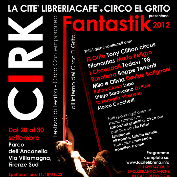 [vc_row css_animation="" row_type="row" use_row_as_full_screen_section="no" type="full_width" angled_section="no" text_align="left" background_image_as_pattern="without_pattern"][vc_column width="1/2"][vc_column_text css=".vc_custom_1606342490482{margin-bottom: 20px !important;}"] CIRK FANTASTIK! 2012 Cirk Fantastik: Festival di Circo Contemporaneo, Teatro, Musica in collaborazione con EL GRITO CONTEMPORARY CIRCUS Settembre 2012 - Parco dell’Anconella Cirk Fantastik! Festival propone spettacoli di compagnie che lavorano nei teatri, piazze, festival d’Europa e non...