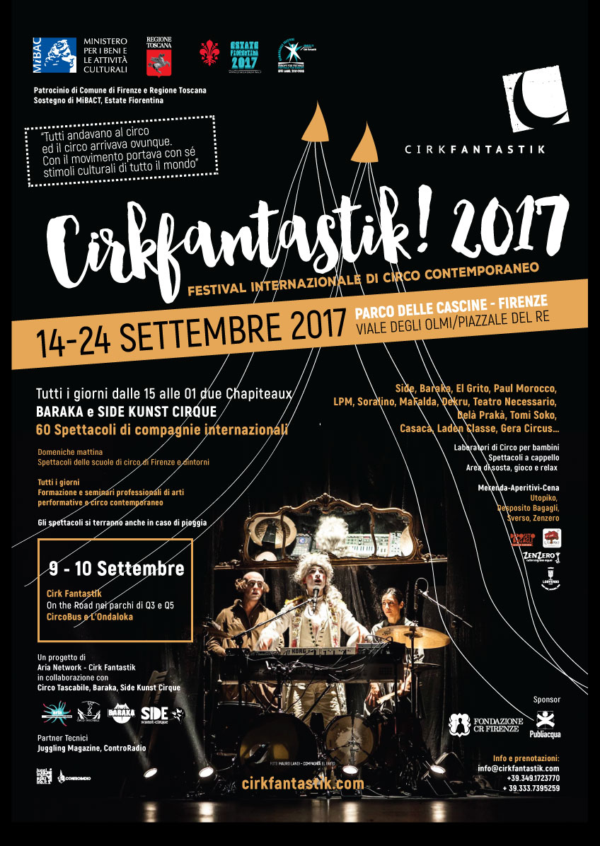 Cirk Fantastik! 2017 porterà per 10 giorni, in un parco pubblico, una parte del movimento frizzante e critico del circo contemporaneo italiano e internazionale. Quest’anno con due Chapiteaux BARAKA e SIDE KUNST CIRQUE che dalle 15 alle 24 ospiteranno spettacoli di compagnie internazionali, premiate nei migliori festival di tutto il mondo.